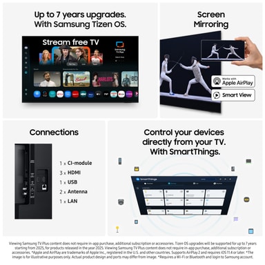 Just nu ingår TV4 Play Plus 3 månader eller TV4 Play Sport 2 månader vid köp av Samsung TV. För att ta del av aktuella erbjudanden, öppna ""Samsung Promotion""-appen på din TV. Läs mer: samsung.com/se/smartstart *Gäller vid köp av utvalda modeller av projektorer och utvalda Samsung TV till och med 2025-03-31. Aktiveras senast 2026.04.30. Värde mellan ca 297 - 498 kr. Se fullständiga villkor: samsung.com/se/smartstart