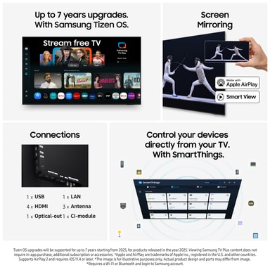 *Tizen OS uppgraderingar stöttas i upp till 7 år med start 2025 - gäller produkter som lanserats år 2025.