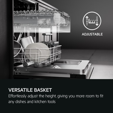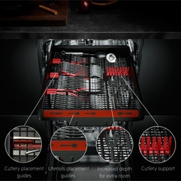 I MaxiFlex-lådan ryms bestick och köksredskap i många olika storlekar, oavsett om de är stora eller har annorlunda form. Flexibla avdelare och maximerat djup betyder att den kan anpassas. De flesta föremålen kan stoppas in och diskas på en gång.