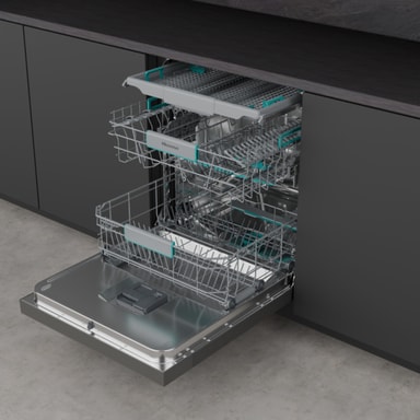 Interiören inkluderar en tredje korg för småsaker och bestick, vilket maximerar utrymme och organisation. Den justerbara överkorgen gör det enkelt att få plats med större tallrikar och ger mångsidighet för olika diskbehov.