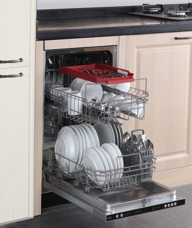 Utforska denna rymliga diskmaskin med 10 kuvert, komplett med bestickkorg och bricka. Få plats med dina diskar och redskap för organiserad rengöring varje gång.