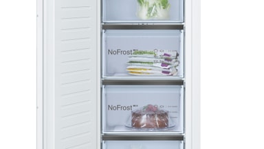 Bosch GIN81HNE0: Integrera stil och effektivitet med denna 212L NoFrost upprättstående frys, med en snabbfrysfunktion och en viskande tyst drift på 35dB.Läs mer om produkten