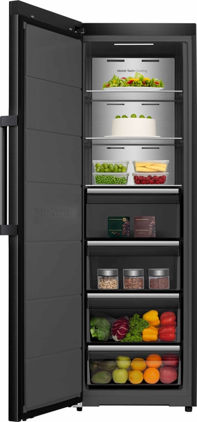 Med ett djup på 60 cm passar KitchenFit-kylskåpet sömlöst in i dina köksskåp. Du får ett modernt, integrerat utseende – utan att behöva välja en helt integrerad produkt. Passar i små och smala nischer. Tack vare en smart gångjärnsdesign kan dörrarna öppnas helt även om kylskåpet står nära skåp eller väggar. Bara 2,5 mm utrymme på sidorna och 5 mm upptill räcker. Full funktionalitet, inga kompromisser. Alla lådor och hyllor kan dras ut helt, och du utnyttjar utrymmet maximalt – perfekt för både nya och befintliga kök.