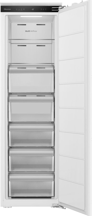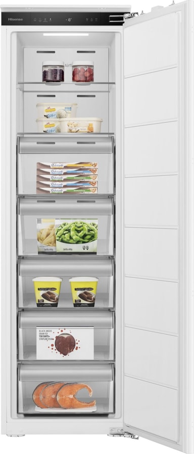 Stor förvaringskapacitet på minimalt utrymme. Den här rymliga inbyggda frysen från Hisense har en fryskapacitet på 235 liter, samtidigt som den passar in sömlöst i vanliga köksskåp för kyl och frys. Den moderna designen i kombination med den enastående kyltekniken från Hisense gör den till ett utsökt tillskott i alla kök. Tack vare den vändbara dörren kan du placera frysen var du vill, oavsett hur köket ser ut, eftersom du kan välja själv om dörren ska öppnas från vänster eller höger.