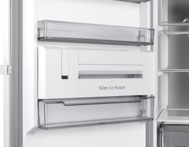 Slim Ice Maker: Njut av en oändlig tillgång på isbitar som bara är en enkel vridning bort, tack vare den smala ismaskinen. För mer bekvämlighet är den integrerad i dörren och lagrar 5 gånger fler isbitar än den producerar.