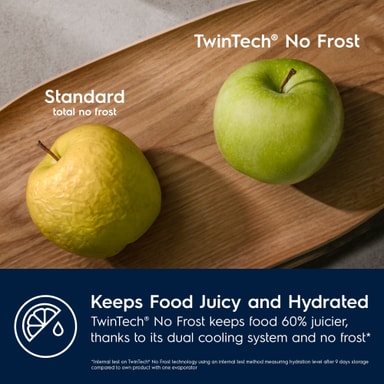 TwinTech® No Frost intelligenta dubbelkylningssystem bibehåller fukten i ingredienserna. Kyl och frys kyls oberoende av varandra, med No Frost-system som är överlägset standardmodeller. I frysen bildas ingen frost. Med TwinTech® No Frost håller kylskåpet rätt fuktighet vilket resulterar i 60 % mindre massaförlust i maten.