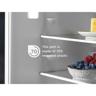 Vi är stolta över att få presentera vår unika kyl-frys med innervägg av 70 % återvunnen plast. Plast från kasserade kylskåp används för att tillverka nya. Det här cirkulära kretsloppet medverkar till reducerat avfall.