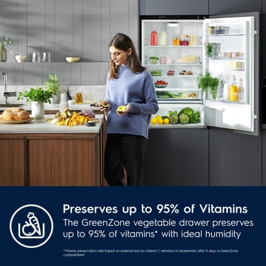 700 GreenZone Kyl-frys har en dedikerad sluten låda med separat klimatfunktion där luftfuktigheten behålls på ideal nivå. Detta bevarar upp till 95 % av vitaminerna efter 11 dagar genom att skydda grönsakerna med den rätta mängden luftfuktighet.*