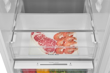 Kylskåpet har en kapacitet på 193 liter, vilket ger gott om plats för alla typer av livsmedel. Interiören är uppdelad i 3 glashyllor, 2 grönsakslådor och en flaskhylla, så varje vara hittar sin plats. Den översta lådan med justerbar temperatur är perfekt för att förvara kött, frukt eller grönsaker. Den nedersta lådan med fuktnivåkontroll skapar en optimal miljö för olika sorters frukt och grönsaker