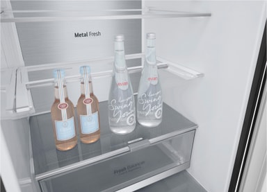 Den bakre väggen med metalldekoration ger interiören en tidlös, förstklassig känsla. * Metal Fresh ™ är ett sammansatt ord som härstammar från orden metalllaminerad design applicerad på kallluftventilen och NatureFresh av Linear Cooling and Door Cooling +. * Användningen av metallkomponenter håller inte i sig maten i kylen fräschare.