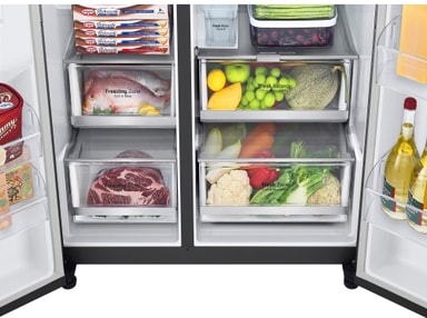 Utöka dina förvaringsmöjligheter med side-by-side kylskåpet LG GSXV91MCAE. Med sin kapacitet är denna vitvara perfekt för det större hushållet. Tack vare smarta funktioner som NoFrost, MultiFlow, DoorCooling, vatten- och isdispenser samt InstaView door-in-door design, förvaras din mat alltid i rätt temperatur och behåller därmed sin smak och fräschör.