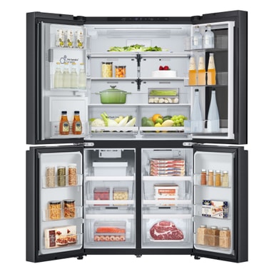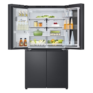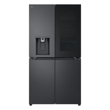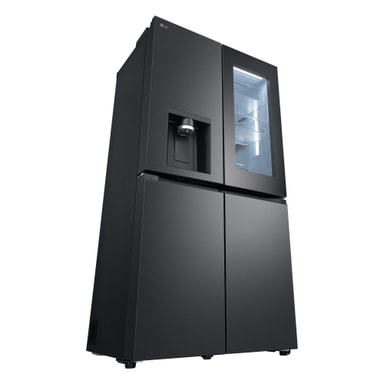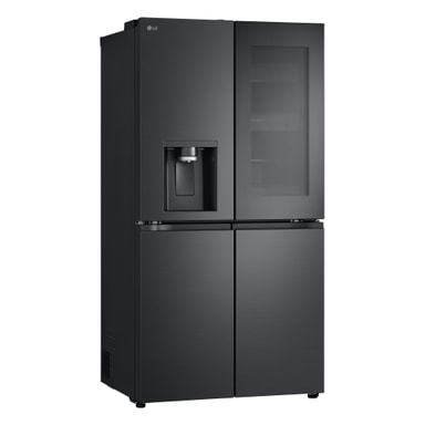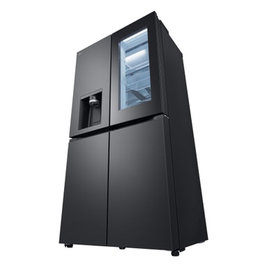 Detta snygga nya InstaView French Door Side-by-Side kylskåp med helt platta dörrar i Essence Black Steel har många funktioner för att bevara maten så länge som möjligt och har också en mycket snygg design.