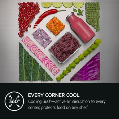 - Cooling 360° ‒ aktiv luftcirkulation till varje hörn, skyddar på alla hyllor.
