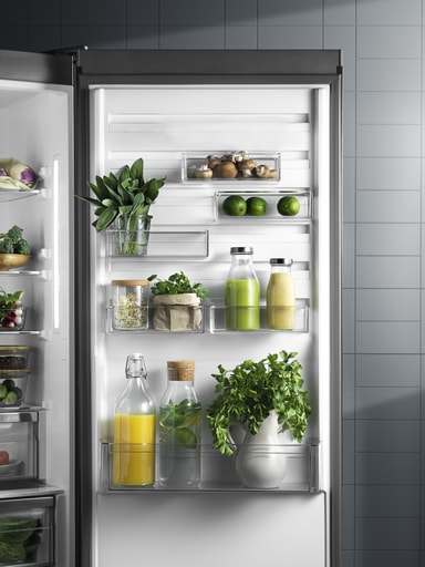 Med CustomFlex® kan du anpassa utrymmet i kylskåpet helt och hållet efter önskemål. Insidan på dörren har flyttbara fack i olika storlekar, så att du kan anpassa utrymmet efter dina behov. Facken är till och med löstagbara så att du kan ta bort dem från kylskåpet för enkel åtkomst.