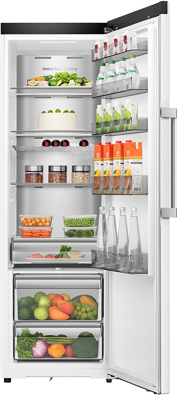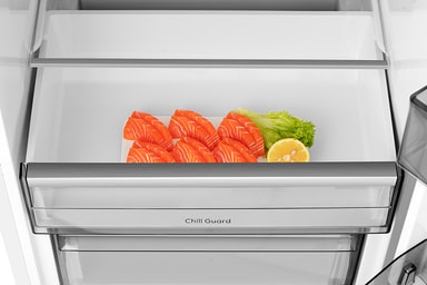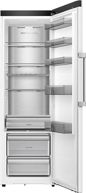 Med ett djup på 60 cm passar KitchenFit-kylskåpet sömlöst in i dina köksskåp. Du får ett modernt, integrerat utseende – utan att behöva välja en helt integrerad produkt. Passar i små och smala nischer. Tack vare en smart gångjärnsdesign kan dörrarna öppnas helt även om kylskåpet står nära skåp eller väggar. Bara 2,5 mm utrymme på sidorna och 5 mm upptill räcker. Full funktionalitet, inga kompromisser. Alla lådor och hyllor kan dras ut helt, och du utnyttjar utrymmet maximalt – perfekt för både nya och befintliga kök.
