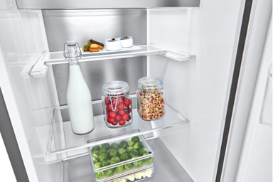 Kylskåpet har 386 liters kapacitet för att enkelt ta emot dina dagligvaror. Varje artikel hittar sin plats tack vare 5 glashyllor, 2 rymliga lådor och flera dörrfack.