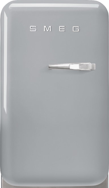 Smeg Kylskåp FAB5LSV6 i elegant Silver erbjuder kompakt elegans med tyst drift på 36 dB, 72,5 cm höjd, justerbara fötter och två hyllor, perfekt för stilren och platsbesparande kylförvaring.Läs mer om produkten