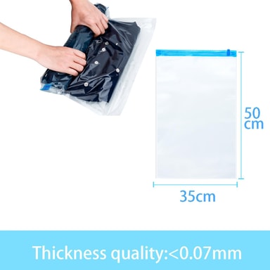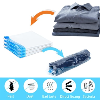 FUNKTION: Våra praktiska vakuumpåsar levereras i ett ekonomiskt paket om 10 och finns i olika storlekar. Lägg helt enkelt kläderna eller sängkläderna i påsen och rulla ihop - klart!
