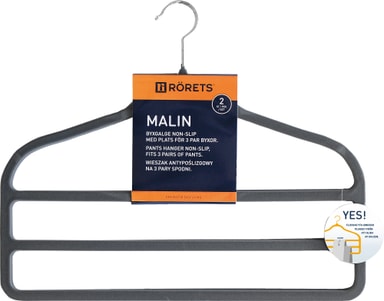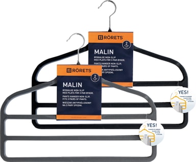 Malin klädhängare har plats för 3 par byxor. Hängaren är tillverkad av stark plast med en flockad yta som förhindrar plagget från att glida av.Läs mer om produkten