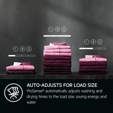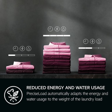 PreciseLoad anpassar automatiskt såväl programtiden som energi- och vattenförbrukningen i förhållande till tvättmängden. På så sätt får du anpassade tvättcykler som sparar energi och vatten när du tvättar och torkar mindre tvättmängder.