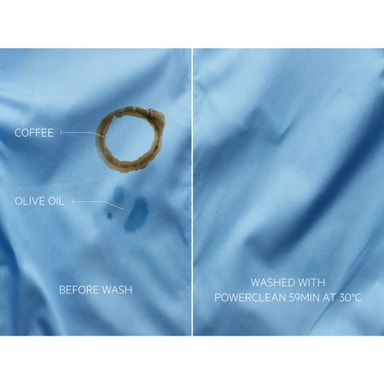 PowerClean ger idealiska tvättresultat genom att använda förblandningsteknik för att se till att tvättmedlet fördelas jämnt på alla plagg. Detta ger bevisad, fullständig fläckborttagning på mindre än 1 timme.* Tekniken anpassar också torktiden beroende på mängden tvätt. Externt test av PowerClean 59 min-programmet i 30 °C-gradigt vatten med 4 kg tvättmängd visar en 100-procentig borttagning av de 50 vanligaste hushållsfläckarna.