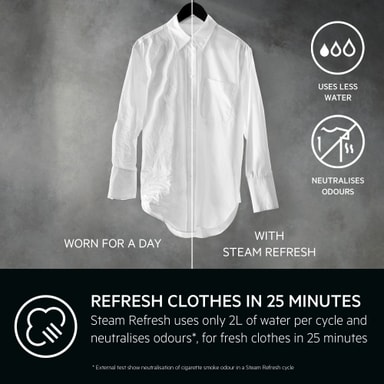 Steam Refresh neutraliserar lukt* och gör dina kläder mindre skrynkliga på bara 25 minuter - även ömtåliga plagg. Och om du vill ha en extra fräsch känsla kan du tillsätta en aromatisk ångdoft. *Interna tester visar att Steam Refresh-programmet neutraliserar cigarettrök.