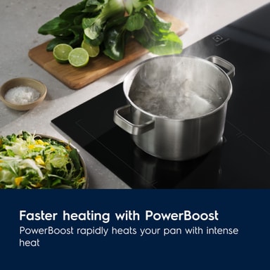 Aktivera PowerBooster-funktionen för att få en omedelbar värmeökning under tillagningen. Perfekt för att få maten klar snabbare. Du kan koka upp vatten snabbare än någonsin och värma kastrullerna så fort de behövs.