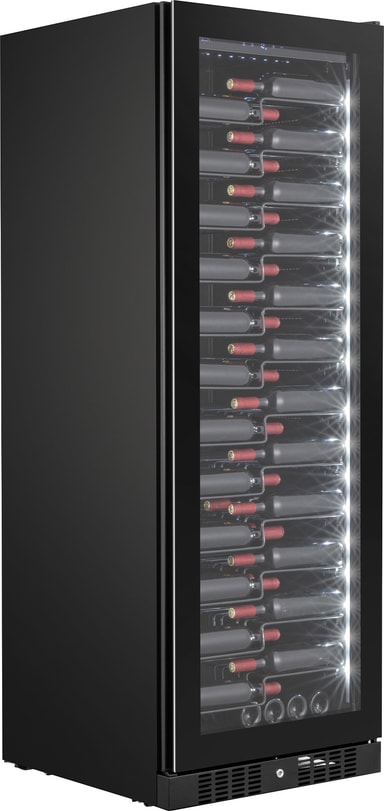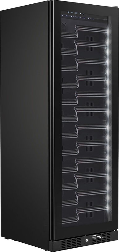 Denna eleganta vinkyl har ett svart frontglas med integrerat handtag. Vinkylens svarta glasfinish passar alla moderna kök.