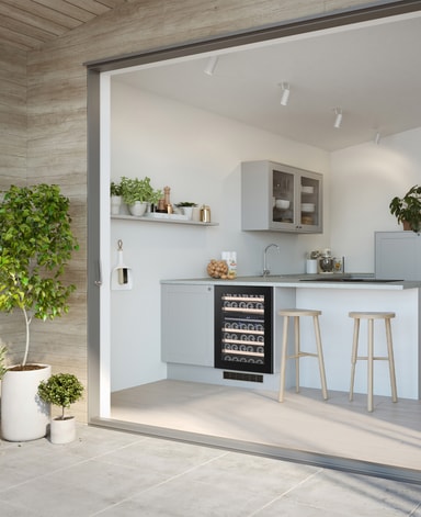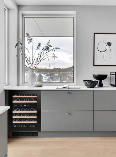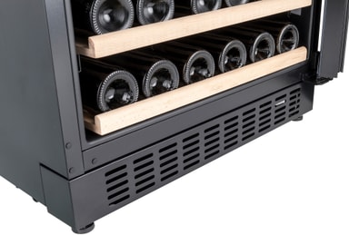 Denna eleganta vinkyl har en skandinavisk och minimalistisk design med ett integrerat handtag. Vinkylen kommer med svart glasfront, trähyllor och LED-belysning.