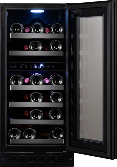 Vinskåpet Sommelier har en stilren ram som passar moderna köksutrymmen. Det fristående skåpet kan användas som en fristående enhet eller placeras under bänkskivor. Den levereras med en ytterdörr i svart glas med höger vändbara gångjärn, ett inbyggt handtag.